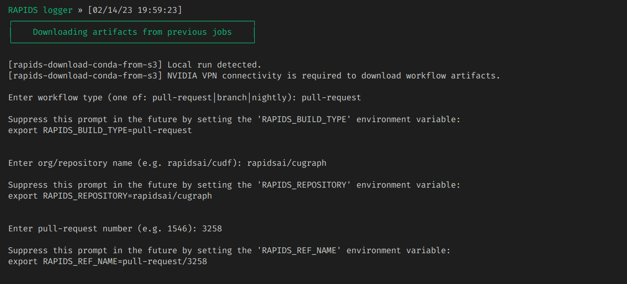 To attempt a complete build and test workflow locally, you can manually update any instances of CPP_CHANNEL and PYTHON_CHANNEL that use rapids-download-conda-from-github (e.g. 1) with the value of the RAPIDS_CONDA_BLD_OUTPUT_DIR environment variable that is set in the RAPIDS CI images.