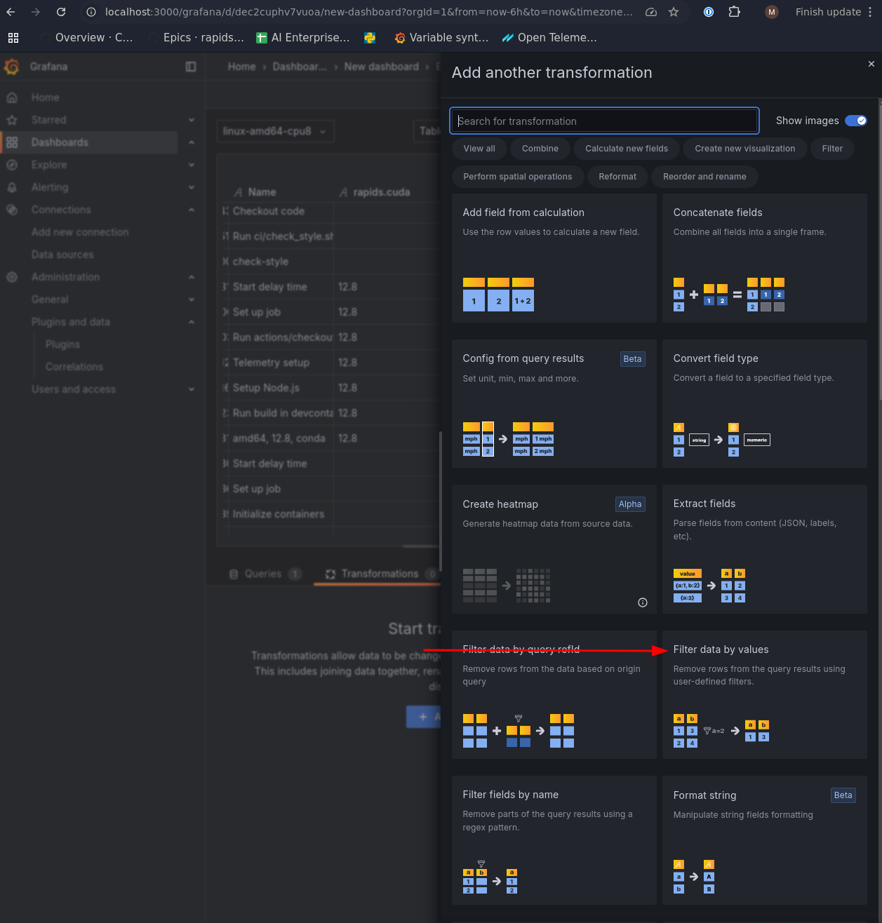 Grafana has something called “dashboard variables,” which serve to select some value for a particular dimension. Using this as the input to the data filters makes it easy to make multiple plots for different values of the variable (e.g. different machine labels or different RAPIDS repos)